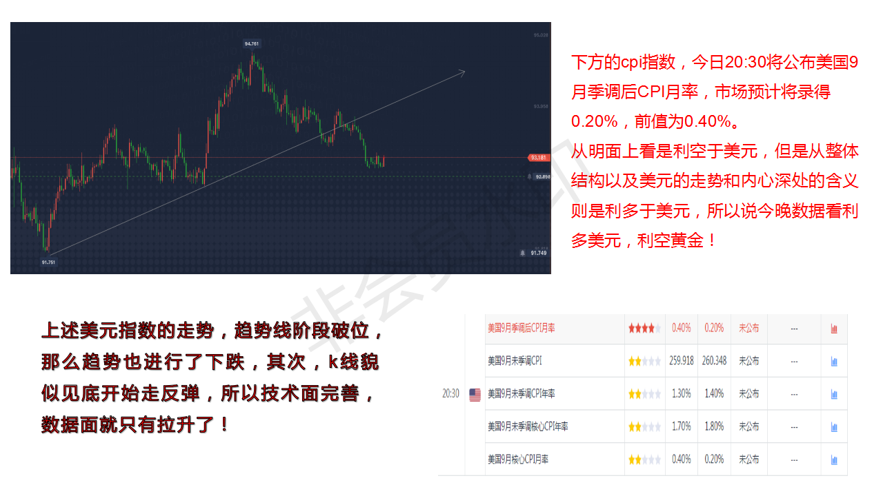 数据面今天有cpi,对于数据来讲的话并不是那么的对于黄金空头有利,因为在本次的预期值是0.2%,前值是0.4%明面上的变现形势并不是太好,所以说对于美元指数的概率学以及第一眼的感觉是利空的,但是怎么说呢?预期低于前值,那么对于公布值的细致化有很大的概率大于预期值,出现利好于美元的概率!所以说趋势的话我还是看多美元!