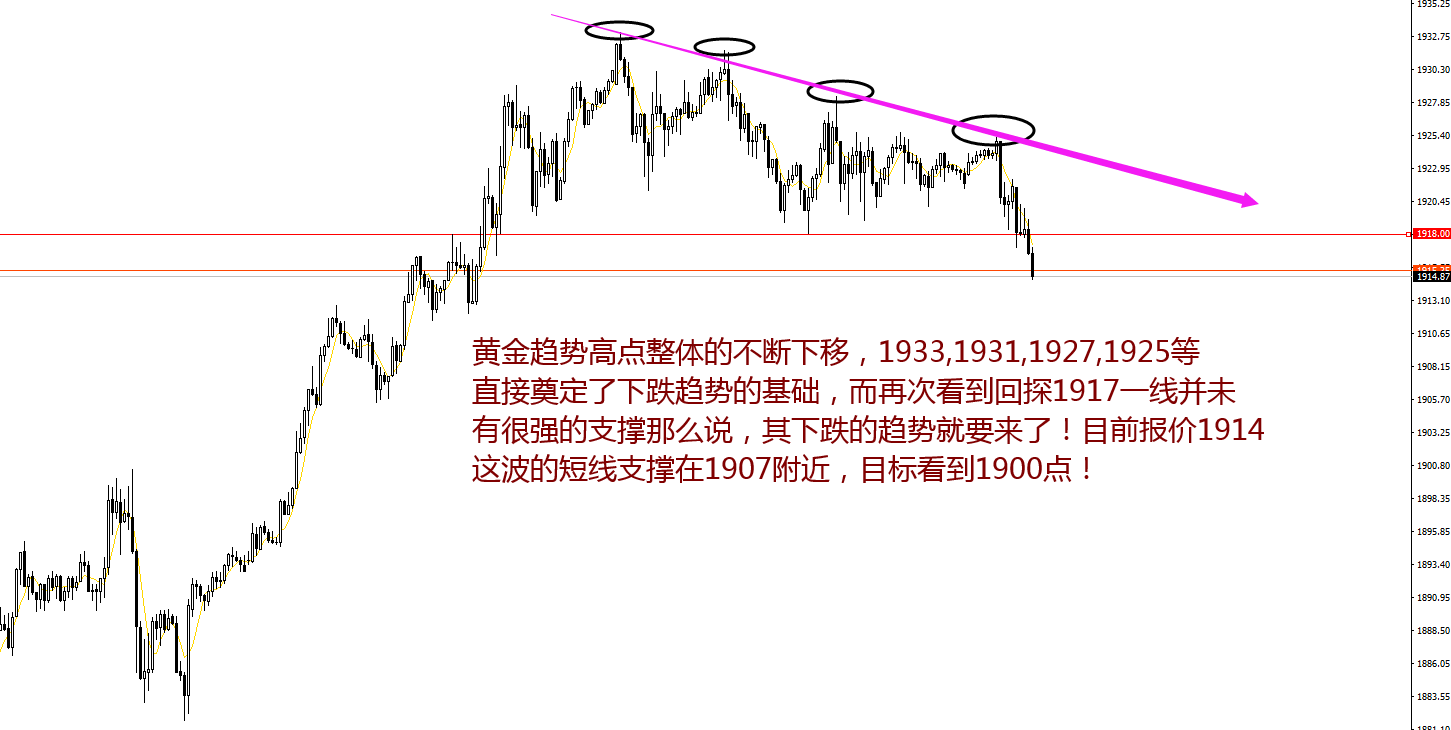 各位投资者朋友们,大家上午好,我是波波,对于市场交易的冷知识想必你们都有了解吧!昨天晚上也给大家说了黄金的整体趋势,怎么讲呢?行情如果上位30绝对是不可能做空的!上方一定会突破,相反行情低点不断的下移,第一次测试1933,1931,1927,1925等一系列就是要进行下跌的大趋势,市场果不其然1917守不住了,那么大概率1900我们就要相见了!