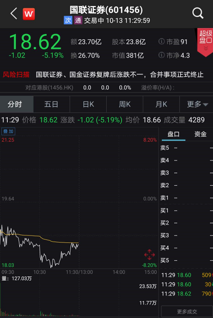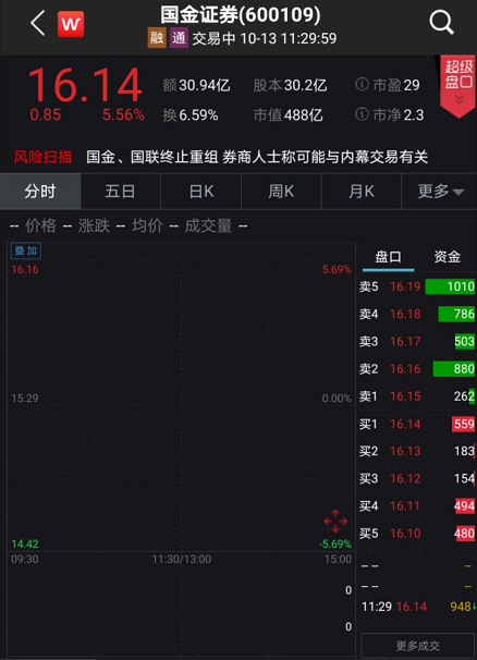 10月13日,两家券商表现却各有不同。当天上午盘前,国联证券在集合竞价阶段迅速逼近跌停,随后跌幅略有收窄。截至午盘,国联证券跌超5%。