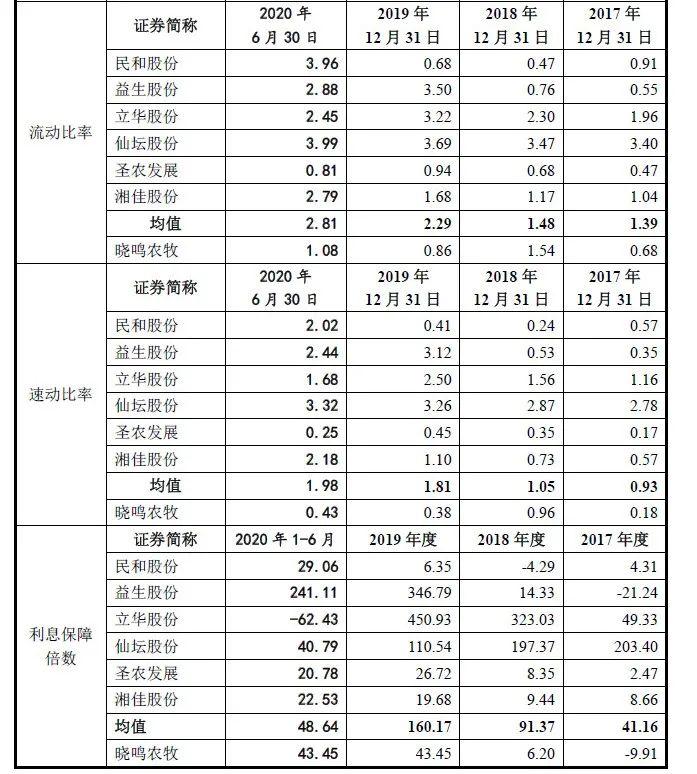从流动比率、速动比率和利息保障倍数来看,晓鸣农牧偿债能力欠佳,资金方面亦存在抗风险能力不足的情况。