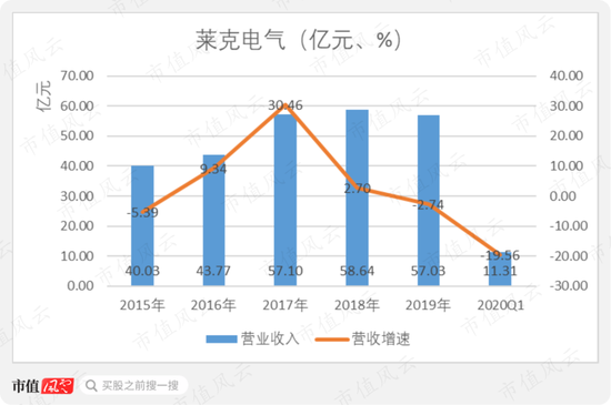 从历年来的收入变化上看,莱克电气的营收快速增长期也就仅仅在2017年持续了一年之久,之后的营收增速急速下滑,2019年同比下滑了2.74%,57.03亿元的收入规模已经不及2017年了。