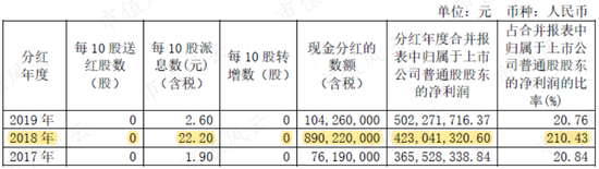 对比来看,2018年的两次分红金额共计8.90亿元,而当年全年的归母净利润只有4.23亿元,分红规模占归母净利润的比重高达2.10倍。