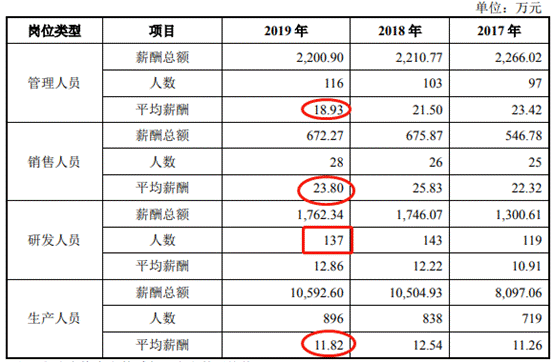 除上述管理层以外,公司其他员工分岗位来看,各期,公司管理人员分别为97人、103人、116人,平均薪酬分别为23.42万元、21.50万元、18.93万元;销售人员分别为25人、26人、28人,平均薪酬分别为22.32万元、25.83万元、23.80万元;研发人员分别为119人、143人、137人,平均薪酬分别为10.91万元、12.22万元、12.86万元;生产人员分别为719人、838人、896人,平均薪酬分别为11.26万元、12.54万元、11.82万元。