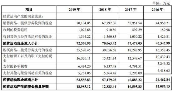 去年,公司营收下滑,但净利增长。2016年-2019年,联德机械营业收入分别为4.23亿元、5.58亿元、7.07亿元和6.82亿元,净利润分别为0.86亿元、1.11亿元、1.61亿元和1.69亿元。同期,公司销售商品、提供劳务收到的现金分别为4.50亿元、5.60亿元、6.78亿元和7.01亿元,经营活动产生的现金流量净额分别为1.21亿元、1.66亿元、1.29亿元和1.90亿元。