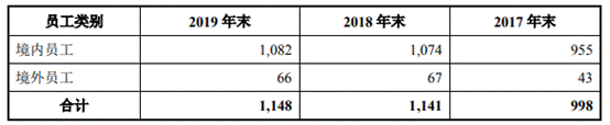2017年-2019年,联德机械员工人数合计分别为998人、1141人、1148人。