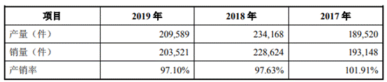 同期,公司产品产量分别为18.95万件、23.42万件、20.96万件,销量分别为19.31万件、22.86万件、20.35万件,产销率分别为101.91%、97.63%、97.10%。
