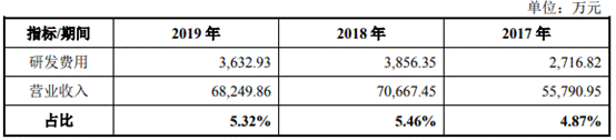 去年,联德机械研发费用金额下滑。2017年-2019年,联德机械研发费用分别为2716.82万元、3856.35万元、3632.93万元,占营业收入的比例分别为4.87%、5.46%、5.32%。