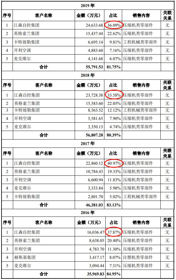 各期,江森自控集团始终为联德机械第一大客户。各期,联德机械向江森自控集团销售收入分别为1.61亿元、2.29亿元、2.38亿元、2.46亿元,销售占比分别为37.87%、40.97%、33.58%和36.09%。