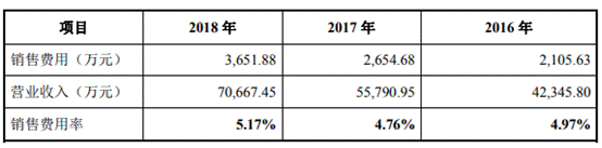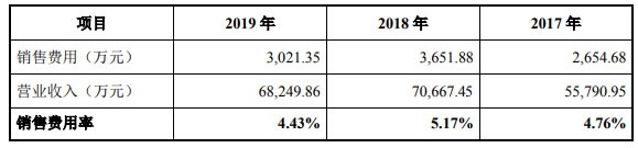 2016年-2019年,联德机械销售费用分别为2105.63万元、2654.68万元、3651.88万元、3021.35万元,占营业收入的比例分别为4.97%、4.76%、5.17%、4.43%。