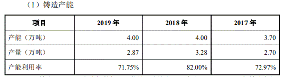 2017年-2019年,联德机械铸造产能利用率分别为72.97%、82.00%、71.75%,机械加工产能设备利用率分别为95.43%、94.69%、78.44%。