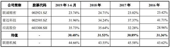 3年1期,联德机械毛利率始终为同行之冠,远超公司招股书所列3家同行——联诚精密、豪迈科技、应流股份。2016年-2018年及2019年1-6月,联德机械毛利率分别为43.62%、45.58%、43.55%、44.66%。同行均值分别为31.36%、30.89%、31.53%、30.48%。具体看,联诚精密毛利率分别为23.42%、23.02%、24.71%、23.74%,豪迈科技分别为41.71%、37.37%、34.24%、31.96%,应流股份分别为28.96%、32.28%、35.64%、35.73%。