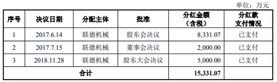 此外,联德机械分别于2017年6月14日、2017年7月15日、2018年11月28日3次决议分红,合计分红1.53亿元。