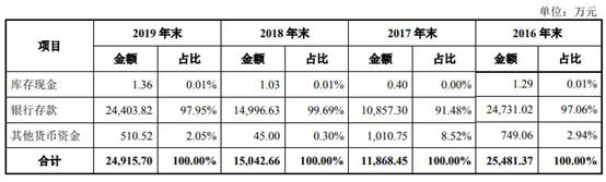 2017年-2019年,联德机械货币资金分别为2.55亿元、1.19亿元、1.50亿元、2.49亿元,其中银行存款分别为2.47亿元、1.09亿元、1.50亿元、2.44亿元。同期公司负债合计分别为1.80亿元、1.90亿元、1.96亿元、1.31亿元。