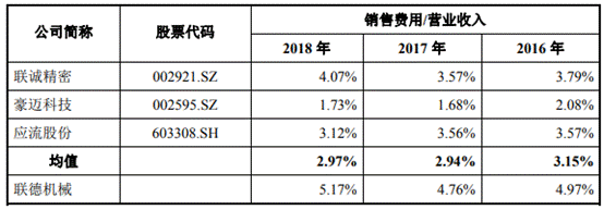 联德机械招股书称,公司与可比公司销售费用率差异较大,整体上公司销售费用率高于可比公司平均水平,尤其较豪迈科技自身销售费用率偏低,其主要原因为该公司客户稳定且销售规模较大,2018年其实现销售37.24亿元,规模效应较为明显。