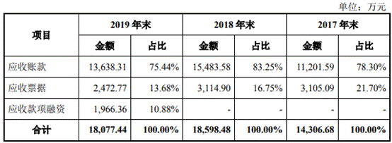 2017年-2019年,联德机械应收账款、应收票据及应收款项融资额合计分别为1.43亿元、1.86亿元、1.81亿元。其中应收账款分别为1.12亿元、1.55亿元、1.36亿元,应收票据分别为3105.09万元、3114.90万元、2472.77万元,去年应收款项融资1966.36万元。