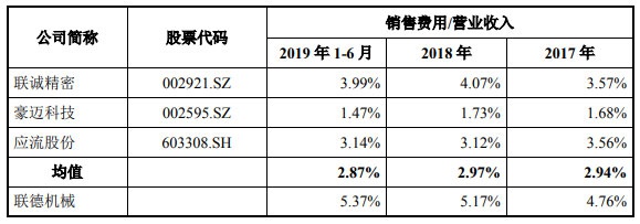 2016年、2017年、2018年、2019年1-6月,联德机械销售费用率分别为4.97%、4.76%、5.17%、5.37%。同行均值分别为3.15%、2.94%、2.97%、2.87%,其中联诚精密销售费用率分别为3.79%、3.57%、4.07%、3.99,豪迈科技分别为2.08%、1.68%、1.73%、1.47%,应流股份分别为3.57%、3.56%、3.12%、3.14%。