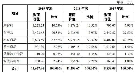 同期,联德机械存货账面价值分别为0.89亿元、1.12亿元、1.16亿元。其中占比最大的为库存商品,各期分别为4407.02万元、5971.15万元、6693.59万元,占比分别为49.75%、53.32%、57.52%。