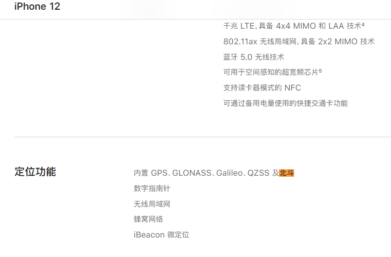 今年,“iPhone不支持北斗导航”一事曾引起网友热议。值得注意的是,iPhone 12系列支持北斗导航。苹果官网显示,在定位功能上,iPhone 12系列内置 GPS、GLONASS、Galileo、QZSS及北斗。