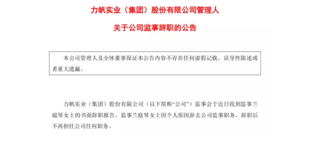 同日晚间,力帆股份还发布了管理人关于公司监事辞职的公告,表示力帆股份监事会于近日收到监事兰庭琴女士的书面辞职报告,监事兰庭琴女士因个人原因辞去公司监事职务,辞职后不再担任公司任何职务。