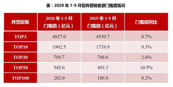 从TOP100门槛来看,数据显示,2020年1-9月,TOP100门槛值为202亿元。其中,TOP3房企门槛值为4927.0亿元,较上年增长8.7%;TOP10房企门槛值为1902.5亿元,较上年增长9.3%;TOP30房企门槛值为788.7亿元,较上年增长2.6%;TOP50房企及TOP100房企门槛值分别为545.0亿元、202.0亿元,同比分别增长10.5%和8.2%。