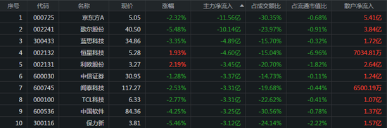京东方A、歌尔股份、蓝思科技行分别遭主力资金卖出11.56亿元、10.14亿元、4.89亿元。