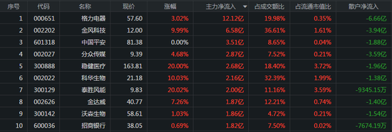 从个股来看,主力资金最青睐的3只股票分别是格力电器、金风科技、中国平安,流入金额分别为12.12亿元、6.58亿元、3.51亿元,所对应的涨幅分别为3.02%、9.99%、0.00%。
