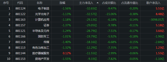 主力资金流出的板块分别是电子制造、光电、计算机应用,主力资金流出金额分别为32.65亿元、32.57亿元、29.13亿元,其中散户净流入金额为5.51亿元、8.48亿元、-3098.05万元。