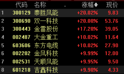 受消息刺激,板块掀起涨停潮,双一科技、泰胜风能、大金重工、东方电缆、金风科技、天顺风能等个股涨停,金雷股份大涨17%。