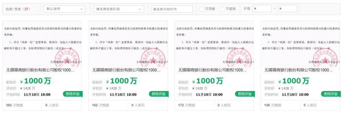 11月10日,开业不足半年的锡商银行将有3.7亿股股份被拍卖。中小银行股权拍卖出现提速,根据阿里拍卖的信息,今年以来已经有2136条银行股权拍卖的信息,包括成交、流拍、中止和即将拍卖的股权,其中流拍股权占比达到6成。