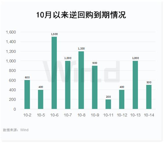 而在国庆长假后,央行暂停了公开市场操作,而10月份以来逆回购到期规模却较大。Wind数据显示,10月1日至8日央行公开市场累计有4700亿元逆回购到期,随后的工作日每日也都有逆回购到期,自10月9日至14日,五个工作日逆回购到期累计达3000亿元。总体上10月以来,央行公开市场逆回购到期已达7700亿,净回笼资金规模较大。