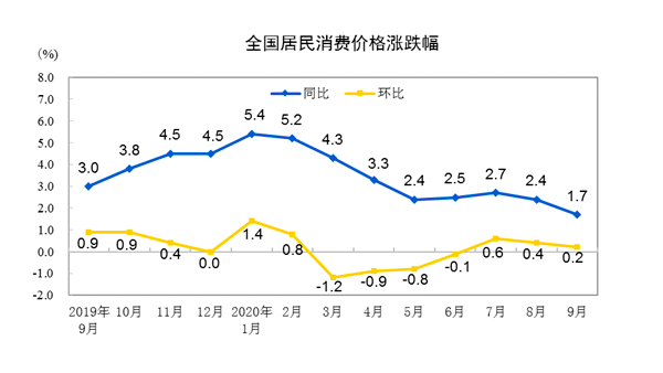 国家统计局15日发布9月份全国CPI(居民消费价格指数)和PPI(工业生产者出厂价格指数)数据。CPI同比上涨1.7%,环比上涨0.2%;PPI同比下降2.1%,环比上涨0.1%。