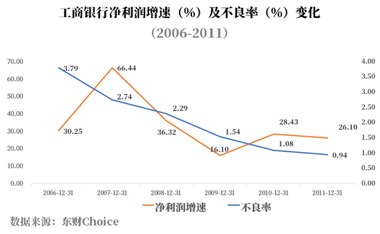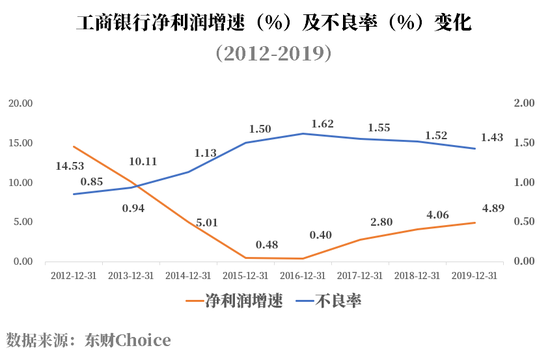 风险的确来了。2012-2016年,中国银行(维权)业经历了一轮系统性的不良上行周期,工行不良率从0.85%攀升到1.62%,账面净利润增速也一度逼近零增长。
