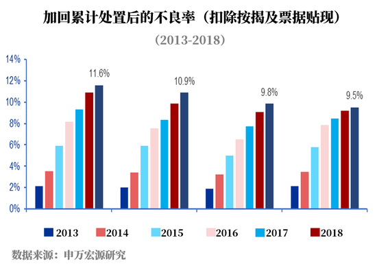 按照申万统计,如果将已处置不良资产加回表内,同时剔除掉按揭、票据贴现等低风险资产,期间产生的不良资产占到四大行当前贷款总量的10%左右。多数人普遍质疑的“潜在不良”并不是被银行“藏”起来,而是被“处置”掉了。
