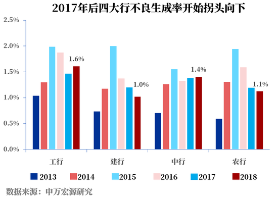 2017年后,四大行不良生成率开始拐头向下。“不良生成率”综合考虑了停在银行账面的问题资产及已处置部分,能够很好衡量银行真实不良生成情况。它的下降意味着银行存量不良压力出现缓解,同时,由于处置大于生成、不良率开始降低。