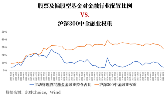 图中,蓝线反映了偏股基金对金融行业的配置情况,橘线则是沪深300中金融公司的权重加总。