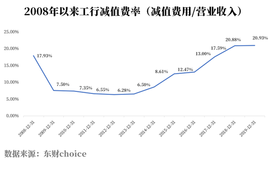 我们以减值损失/营业收入,衡量资产质量变化及审慎性拨备计提给银行业绩带来的影响。2009年减值费率从17.93%降低到7.5%,12年后持续攀升,从6.28%上升到了2019年的20.93%。这意味着,2019年工行2成以上营业收入都计提为了拨备,是12年的3倍以上,这是处置历史问题资产所致。