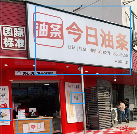 从招牌到口号,再到菜单,网红店今日油条和今日头条APP有多处相似点。从装修风格来看,这家店主要使用了红白两色,招牌上的字体和图标都与今日头条相似。