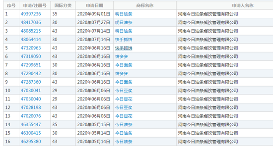 值得一提的是,红星新闻记者在中国商标网查询发现,前者在注册后的第二天就开始申请商标,从5月至今共申请了16个商标,商标包括“今日油条”“饼多多”以及“快手抓饼”等。