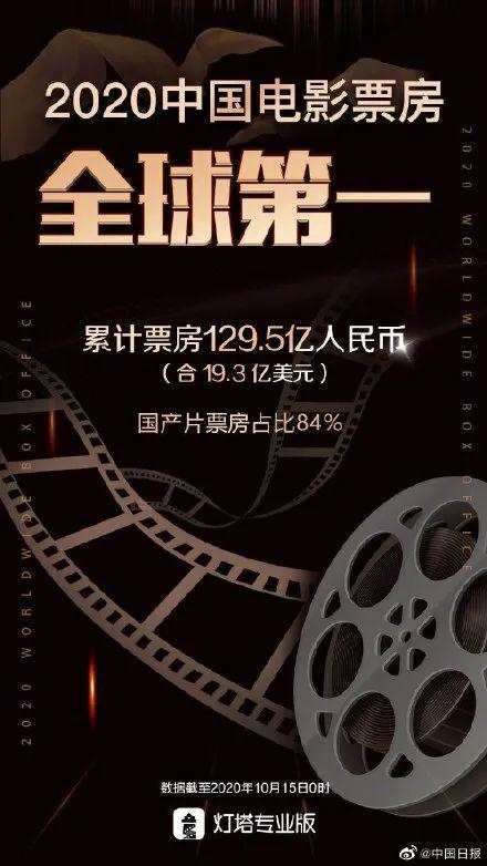 数据说话,截至10月15日0时,2020年中国电影票房市场以129.5亿人民币(合19.3亿美元),正式超越北美,历史上首次成为全球第一大票仓。其中,国产电影票房占比近85%。