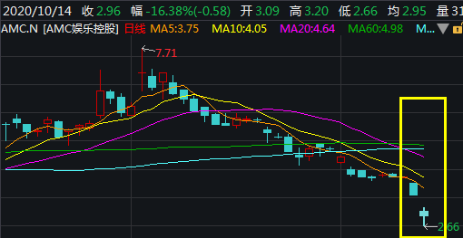 虽然公司随后回应称“没有考虑申请破产保护”,并表示将通过卖资产、拉融资等手段筹集资金,但AMC的股价连续两天跳水,截至美东时间10月14日收盘,AMC从两天前的4.0美元/股跌至2.96美元/股,跌幅达30%,公司总市值也已仅剩3.24亿美元。
