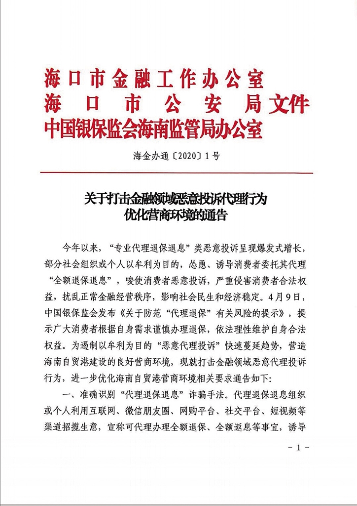 目前,省内金融监管部门、公安机关、保险行业协会对代理退保恶劣影响高度重视,出重拳打击。近日,海口市金融工作办公室、海口市公安局和海南银保监局联合发布通告,提示广大消费者准确识别“代理退保退息”诈骗手法,共同打击金融领域恶意投诉代理行为。