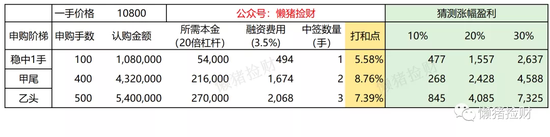 这一手中签率,1-9手基本没什么太大变化,打新9手中1手概率10.35%,就比打1手多了0.35%,分配给一手党的比例算比较高,一般分配给一手党比例高的比较容易出现这种情况,这种情况下小甲融资打10手性价比远不如现金打1手。
