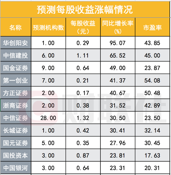 choice数据显示,共有11只券商股进入收益涨幅较大榜单。按照每股收益增长率来看,华创安阳同比增长率95.07%排在第一,头部券商中信建投65.52%排在第二,国金证券49.00%排在第三。