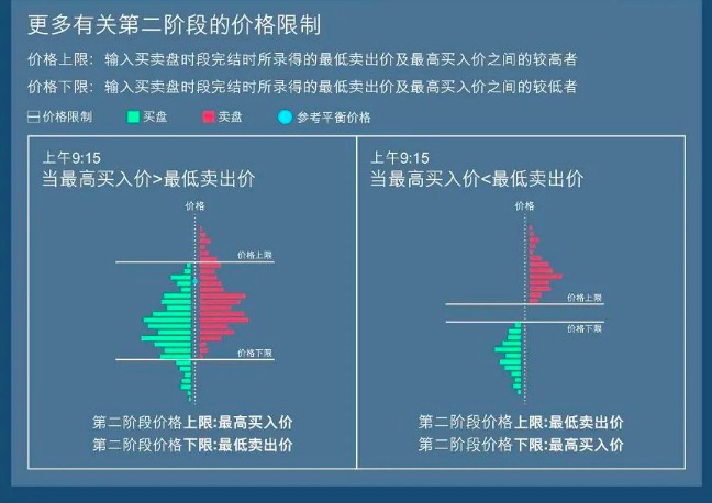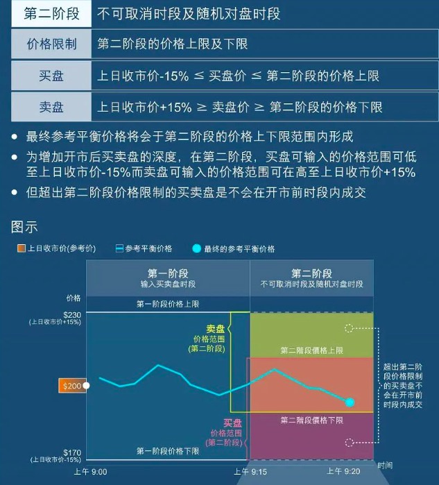 为了增加开市后买卖盘的深度,在第二阶段,买盘可以在低于上日的收市价15%至第二阶段的上限之间输入,而卖盘可以在高于上日收市价15%至第二阶段的下限之间输入,但是超出第二阶段价格上下限范围的买卖盘,不会在开市前时段内成交。