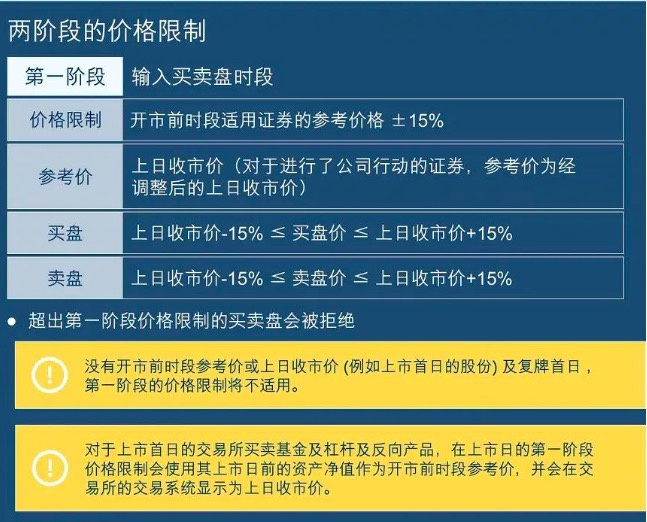 在第一阶段,即15分钟的输入买卖盘时段,投资者可以输入、更改或取消买卖盘。可输入的价格范围是适用证券的参考价上下15%,参考价为上一个交易日的收市价,对于发生了公司行为的证券,参考价为经调整后的上日收市价。