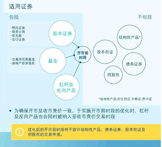 优化后的开市前时段,将不再涵盖所有的证券,而只会涵盖股本证券(包括预托证券、投资公司、优先股及合订证券)、基金(包括交易所买卖基金及房地产投资信托基金)、杠杆及反向产品。