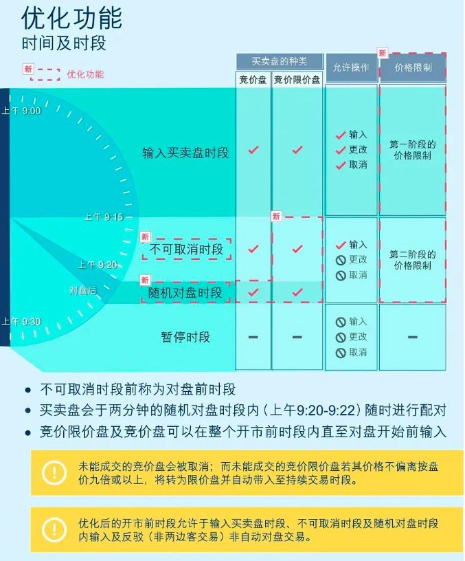 根据香港联合交易所有限公司(下称“联交所”)的规定,该所在交易层面将主要进行三项优化,第一项是引入两个阶段的价格限制,防止在开市时出现过度的价格波动;第二项是加设随机竞价对盘,这有别于现在只允许在输入买卖盘时段内输入竞价限价盘;第三项是允许以不低于上日收市价的价格进行卖空。