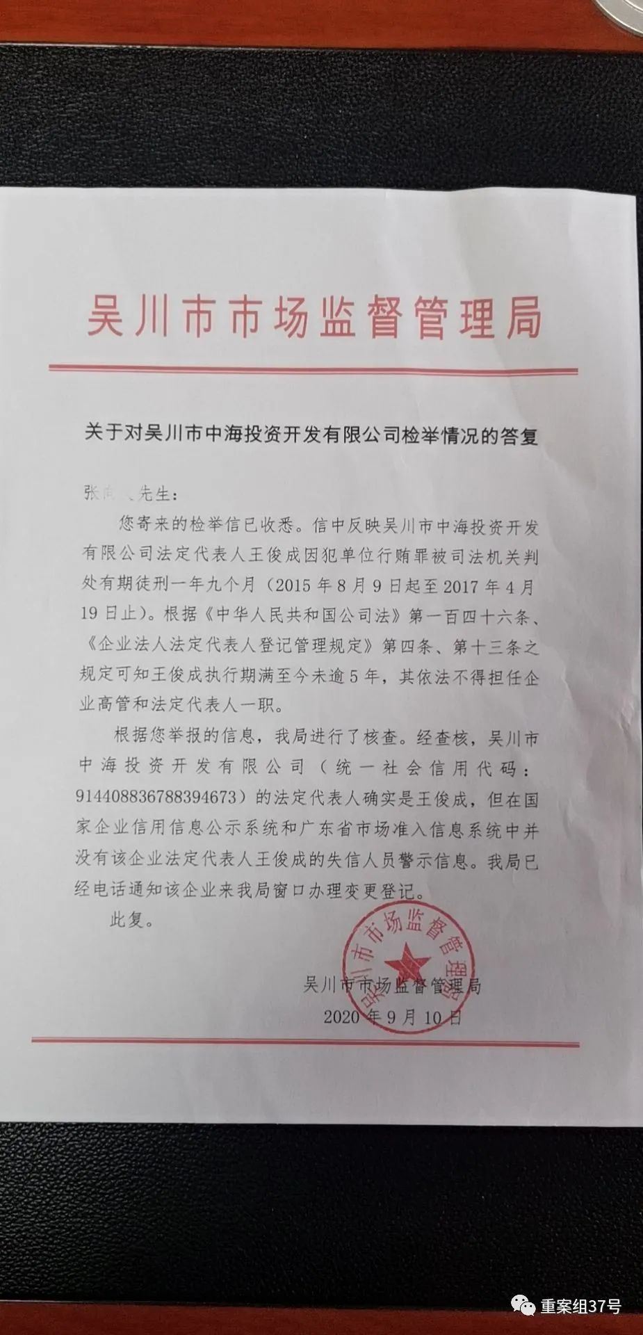 新京报记者日前从吴川市市场监管局了解到,9月10日,该局对举报答复表示,中海投资开发有限公司法定代表人确是王俊成,但国家企业信用信息公示系统和广东省市场准入信息系统并没有显示王俊成的失信人员警示信息,该局已经电话通知企业前往窗口办理变更登记。