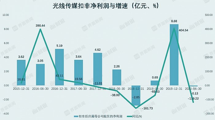 但实际上,光线传媒从2017年起,扣非后净利润就一路走低。2018年扣除出售新丽传媒的22亿元投资收益,光线传媒扣非后净利润亏损2.85亿元。2019年若非有《哪吒》,光线传媒难言翻身。