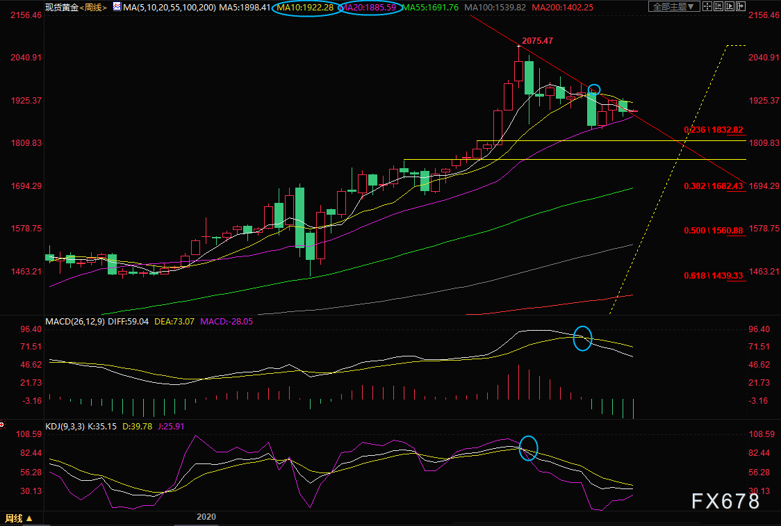 由于目前20周均线仍给金价提供较好的支撑,若金价顶破10周均线1922.28附近,则增加短线看涨信号;9月25日当周高点阻力在1955.68附近。